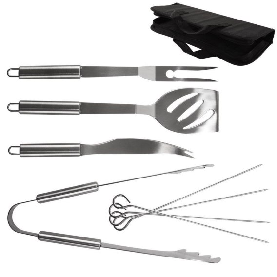 • ZESTAW DO GRILLOWANIA - Zestaw składający się z dziewięciu pomocnych przyborów podczas grillowania lub pieczenia. W skład zestawu wchodzi: łopatka do obracania, widelec, szczypce, nóż, szpikulce do szaszłyków oraz etui.