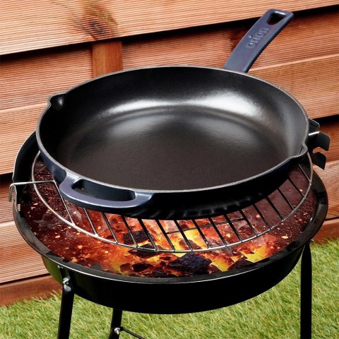 <p>Okrągła patelnia żeliwna idealna do przygotowywania różnego rodzaju potraw. Wyposażona w dłuższy i krótszy uchwyt. Patelnia zapewnia szybkie i jednolite smażenie. Możemy użytkować ją w każdej kuchence, ale również bezpośrednio na grillu, czy ogniu. Patelnia jest niezwykle solidna i ciężka. Żeliwo rozgrzewa się równomiernie i długo utrzymuje ciepło, dzięki czemu serwowane dania dłużej będą ciepłe. <b>Oryginalny produkt czeskiej marki Orion.</b> Wyprodukowano zgodnie z europejskimi standardami</p>