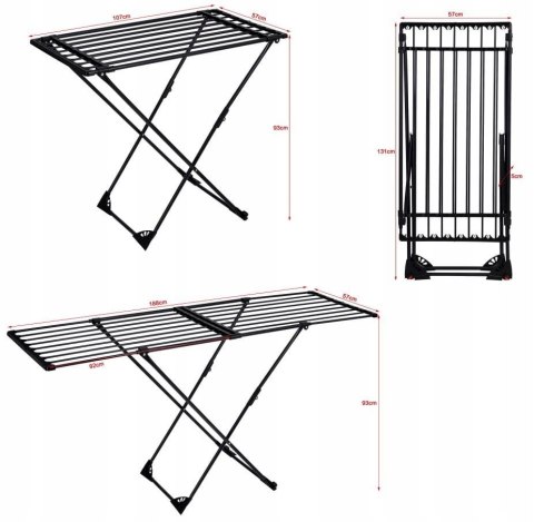 Suszarka pozioma, stojąca, posiada rozsuwane skrzydła, które umożliwiają suszenie większej ilości ubrań. Skrzyła są teleskopowe, a nie jak w większości suszarek składane (do środka). Dzięki temu skrzydła wysuwasz tylko wówczas gdy jest potrzeba. Dzięki grubym drutom zapobiega powstawaniu zagnieceń na częściach garderoby jednocześnie skracając proces prasowania.